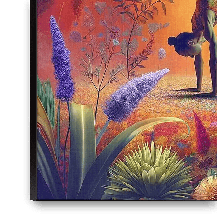 L'image révèle une scène onirique dans laquelle une acrobate fait le poirier dans une prairie colorée remplie de fleurs. Elle se tient la tête en bas, les jambes tendues en l'air, comme si elle pouvait toucher le ciel. Le paysage environnant est une mer de fleurs de différentes formes et couleurs, du violet profond au bleu vif.…