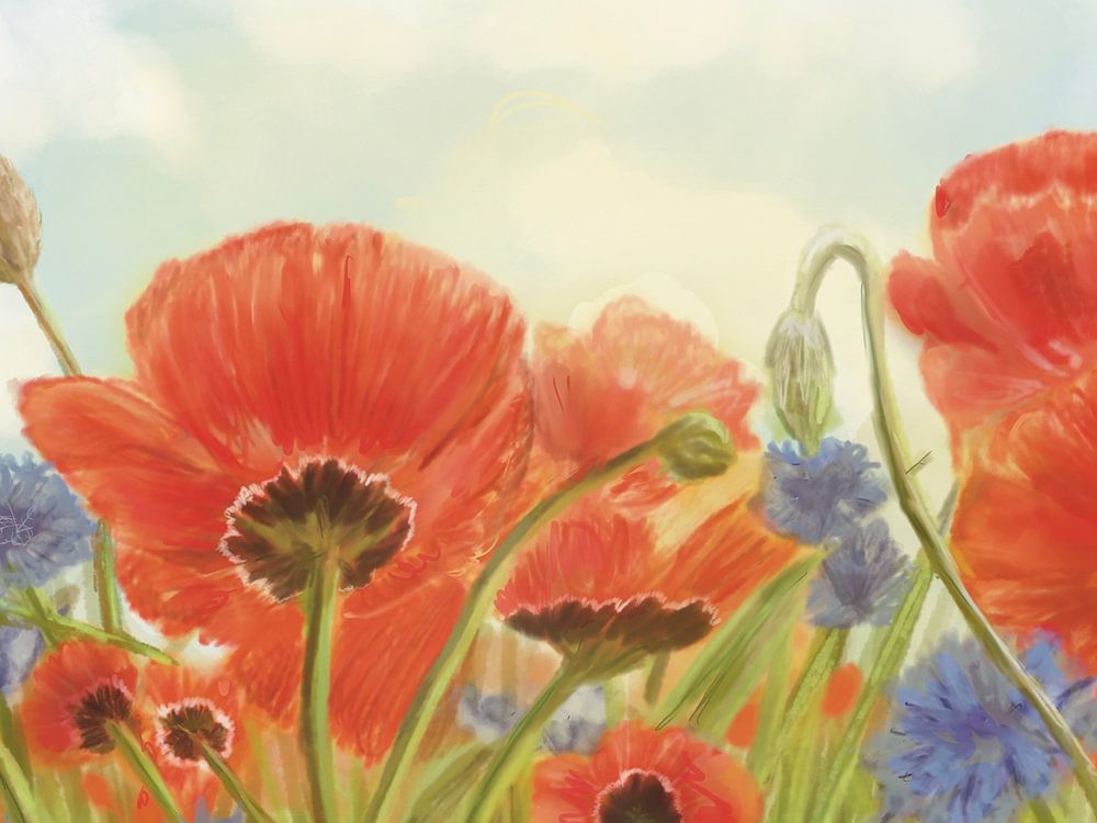 Cette aquarelle numérique montre une prairie fleurie au lever du soleil, avec des coquelicots et des fleurs violettes qui cherchent la lumière du matin. Les fins coups de pinceau et les couleurs vives donnent vie aux fleurs, tandis que le soleil levant illumine la scène. Les tons chauds et dorés des rayons du soleil créent une atmosphère paisible et accueillante. Capturant l'essence d'un matin frais dans la nature, cette œuvre d'art ajoute une touche de calme et de beauté à n'importe quelle pièce. Parfait pour les amateurs de fleurs et d'art naturel, ce tableau apporte une touche de plein air dans votre maison.