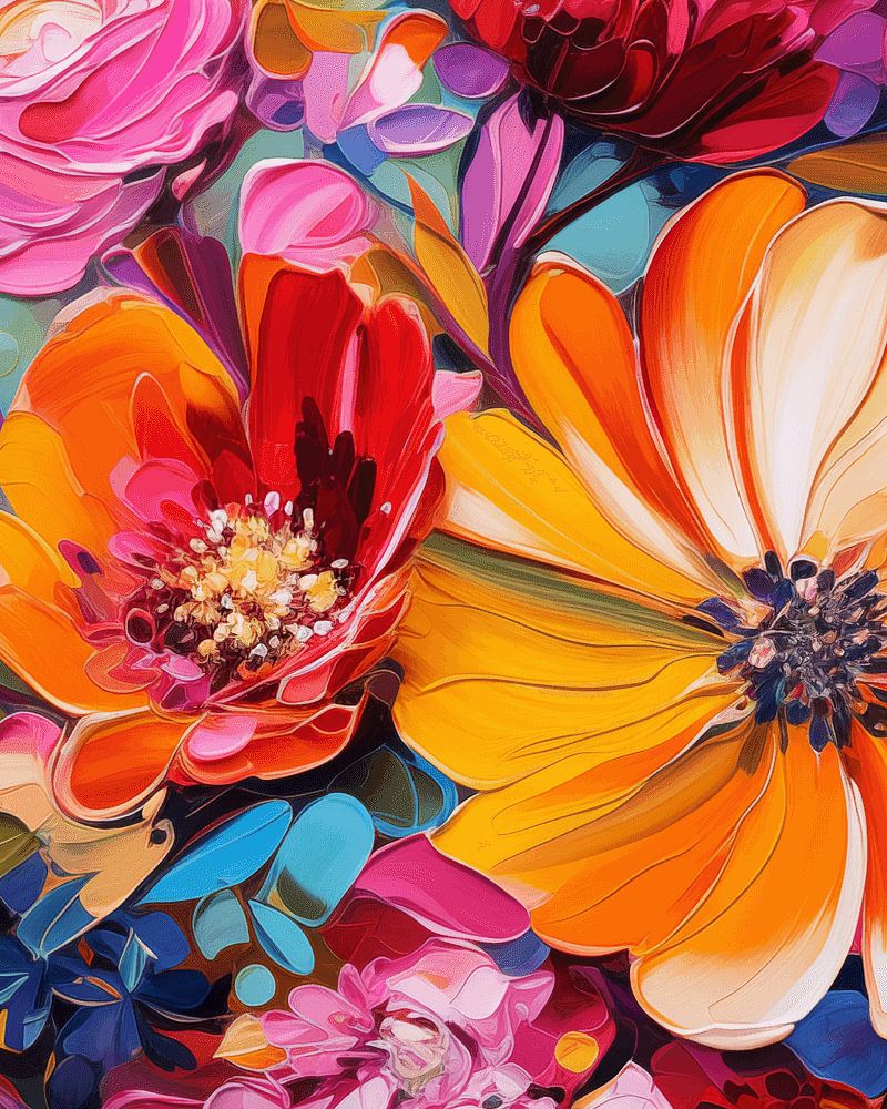 Abstract Floral Dream est une composition en couches de formes florales et de zones de couleur. Les couleurs se fondent les unes dans les autres, avec une base de sable, de beige et de rose clair, complétée par des accents de rose néon, d'aqua et d'orange. Les formes ne sont pas réalistes mais rappellent clairement des pétales, des tiges et des fleurs.