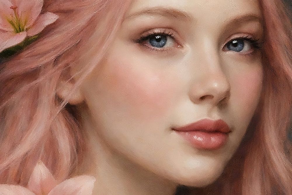 Dans cette image, la douce puissance de la beauté féminine rencontre la tendresse de la nature. Ses mèches roses coulent comme une rivière rêveuse, ornées de lys. Son regard est clair, presque éthéré, comme si elle détenait un secret que seul le silence peut révéler. Le portrait dégage une harmonie poétique de fragilité et de…