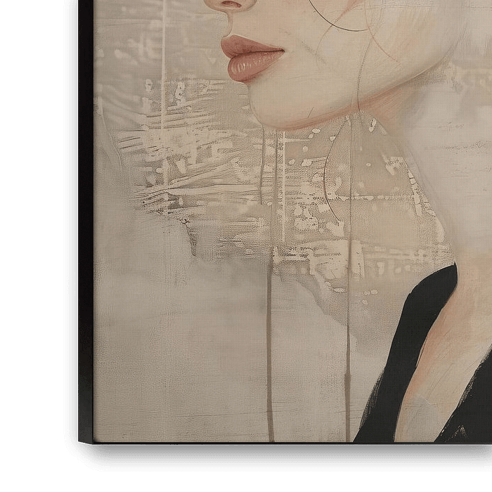 Dreaming Aloud - Ce tableau pour femmes représente une femme calme et sereine, les yeux fermés, concentrée sur sa réflexion intérieure. La femme, dont le visage de porcelaine rayonnant est calmement détourné, combine la douceur et la richesse des détails du réalisme avec un arrière-plan d'éléments abstraits, d'apparence presque industrielle. Ses cheveux, qui flottent de manière dynamique sous l'effet d'une brise invisible, sont colorés dans des nuances de rouge rouille profond qui passent à des tons de terre plus subtils, offrant un beau contraste avec sa peau légèrement tonique. L'arrière-plan est un mélange de nuances de gris doux et rugueux, parsemé de taches et de rayures irrégulières qui suggèrent à la fois la texture et le hasard. L'utilisation de techniques réalistes et abstraites contribue à la création d'une œuvre intrigante et profonde qui explore à la fois la douceur et les aspérités de la vie.