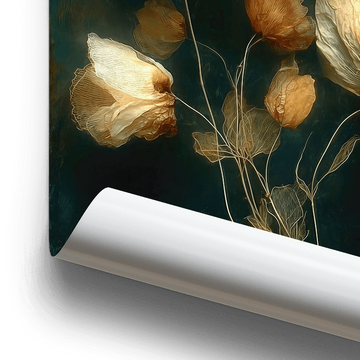 Un bouquet de fleurs translucides, couleur crème doré, qui brillent sur un fond sombre et mystérieux, alliant douceur et force tranquille, dans une lumière presque éthérée.