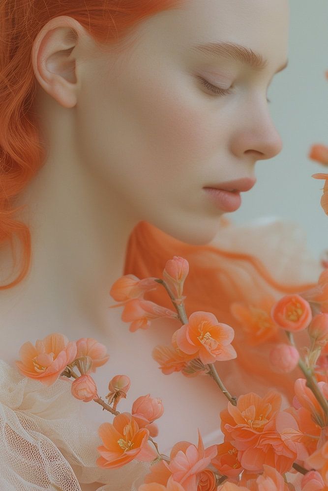 Portrait d'une belle femme à la peau de porcelaine et aux cheveux orange. Ses cheveux s'harmonisent avec la magnifique fleur de cerisier orange. Elle porte une robe en soie qui fait honneur à sa peau. L'arrière-plan est gris-bleu clair. S'accorde avec différents styles et tendances, y compris la fleur de cerisier. printemps, été. portrait. Artiste : Bianca ter Riet