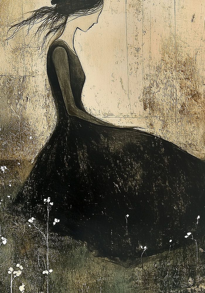 Dreams in the petit flowerfield montre une femme assise en silence dans une belle prairie aux couleurs vertes et émeraude profondes, entourée de délicates fleurs blanches. L'arrière-plan est beige parcheminé et doré, encadré par des branches abstraites sombres. S'adapte à différents styles et tendances, y compris l'abstrait moderne, le botanique, le naturel.
