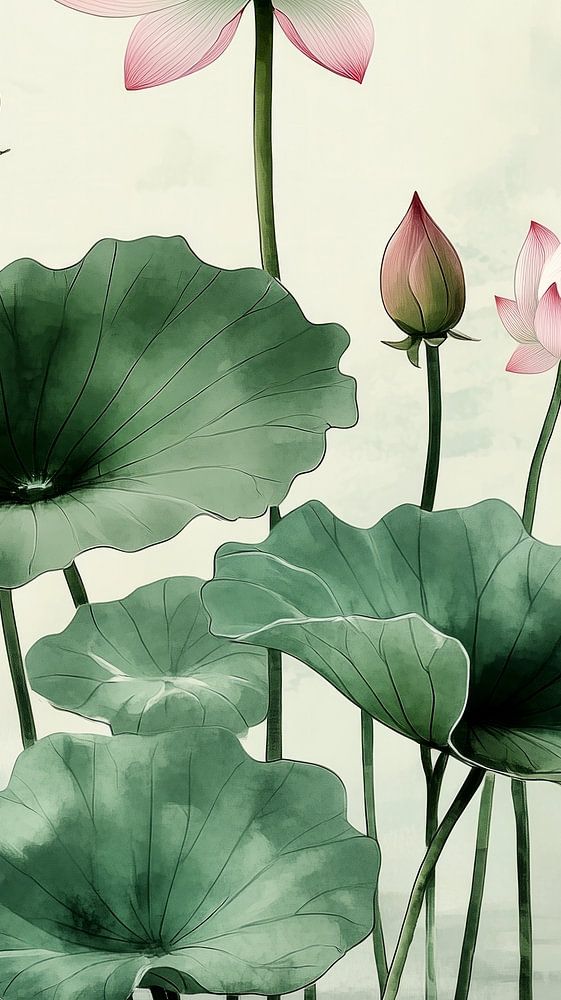 Cette peinture représente avec sérénité une plante de lotus, magnifiquement décrite dans un style délicat et encré qui rappelle l'art chinois traditionnel. Au premier plan se trouvent plusieurs fleurs de lotus à différents stades de floraison. La plus grande fleur est complètement ouverte, avec des pétales roses et blancs qui se détachent gracieusement sur un fond vert pastel clair. Les bourgeons plus petits symbolisent la croissance et la puissance.
