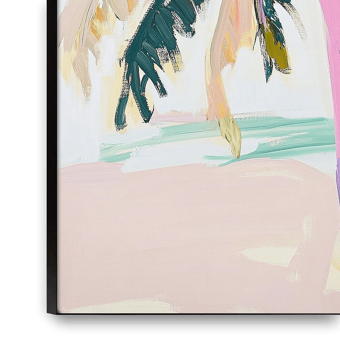 Un tableau représentant deux palmiers sur la plage, peint à coups de pinceau épais dans des tons roses et verts. Le fond est blanc et il y a quelque chose d'abstrait. Il semble vivant et joyeux