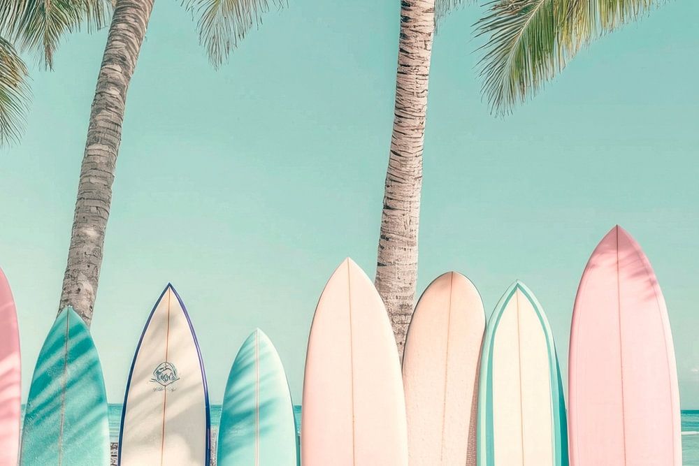 Un vent doux joue avec les palmiers, tandis que des planches de surf aux couleurs pastel sont disposées dans le sable dans un arrangement harmonieux. Leurs douces nuances de rose et de menthe s'harmonisent parfaitement avec le bleu éclatant de la mer en arrière-plan. Il s'en dégage un sentiment de détente et d'aventure, invitant à la fois les surfeurs et les rêveurs.