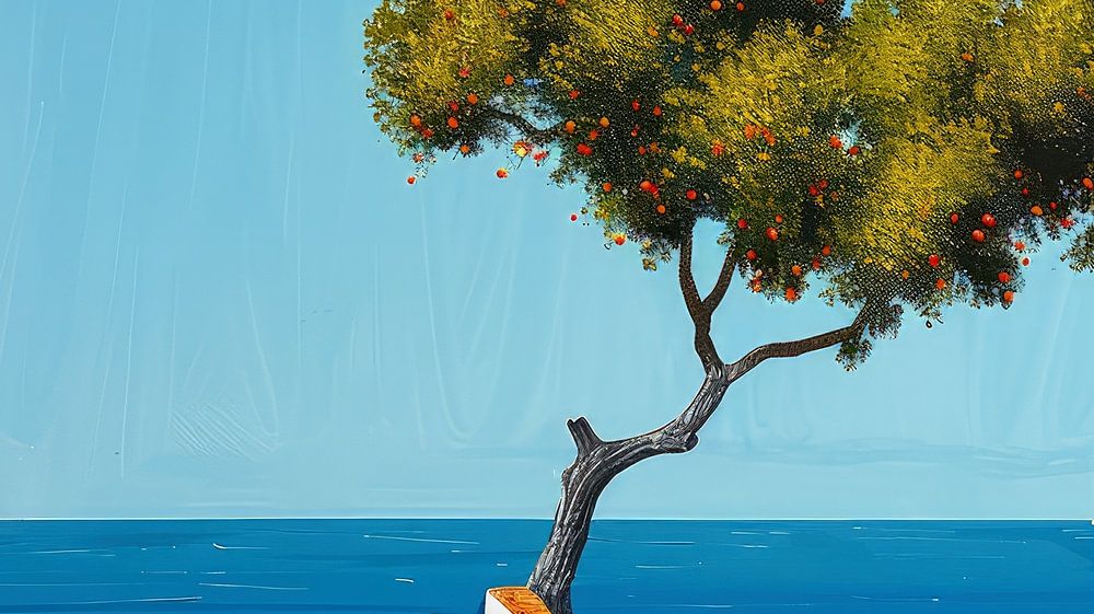 Un mur blanchi à la chaux avec des ouvertures minimalistes, caractéristiques de l'architecture de la région égéenne, est visible sur la gauche. La scène s'ouvre sur un patio aux tons chauds de terre cuite et un muret blanc, contrastant parfaitement avec les eaux bleues intenses de la mer. Au centre, un arbre ornemental aux feuilles vertes et aux petits fruits orange ajoute un élément ludique au design épuré. À l'arrière-plan, la côte s'étend, baignée d'une douce lumière solaire, tandis qu'un voilier solitaire se profile à l'horizon.