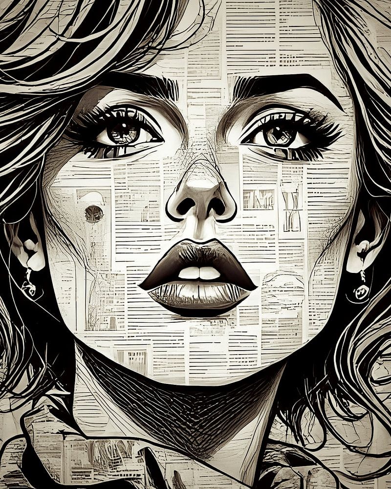 Dans cette image impressionnante se déploie une composition fascinante qui réunit différentes techniques de mixed media. La scène montre un modèle photo dont le visage et le corps se fondent harmonieusement dans un arrière-plan artistique composé d'un mélange créatif de peinture acrylique, de coupures de presse et de morceaux d'images de magazines. Les couleurs vives et les formes dynamiques captivent immédiatement le spectateur et créent une atmosphère vivante.