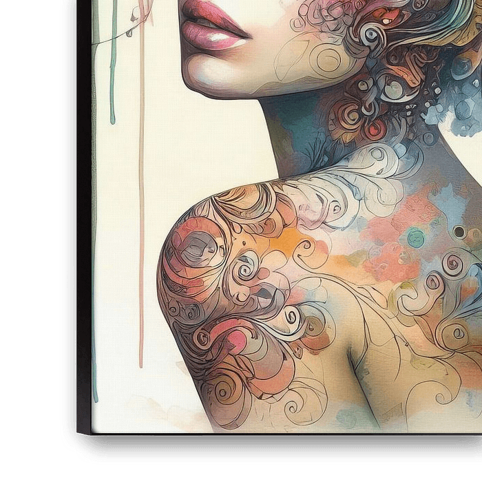 L'ambiance est sereine et onirique, une pause entre la respiration et la pensée. Imprimé en grand format, l'arrière-plan aéré donne à la composition l'espace nécessaire pour s'épanouir, ce qui en fait un point de mire élégant pour les intérieurs contemporains. Elle équilibre les traits précis du visage avec un rythme botanique orné, ce qui la rend à la fois moderne et intemporelle.
