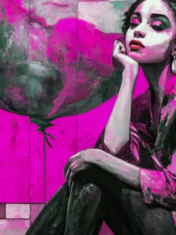 Imaginez une salle d'attente silencieuse dans une gare, où brille un globe terrestre. En dessous, une silhouette élégante est assise - pas n'importe qui, mais l'incarnation de notre propre envie d'ailleurs. Ici, le rose vif et le vert nuageux se fondent en une mosaïque vibrante qui promet chaque pas vers le lointain. L'image ne raconte pas une biographie, mais un moment universel : le monde attend, et pourtant nous profitons de la douce pause qui le précède, lorsque les rêves sont plus grands que n'importe quel horaire.