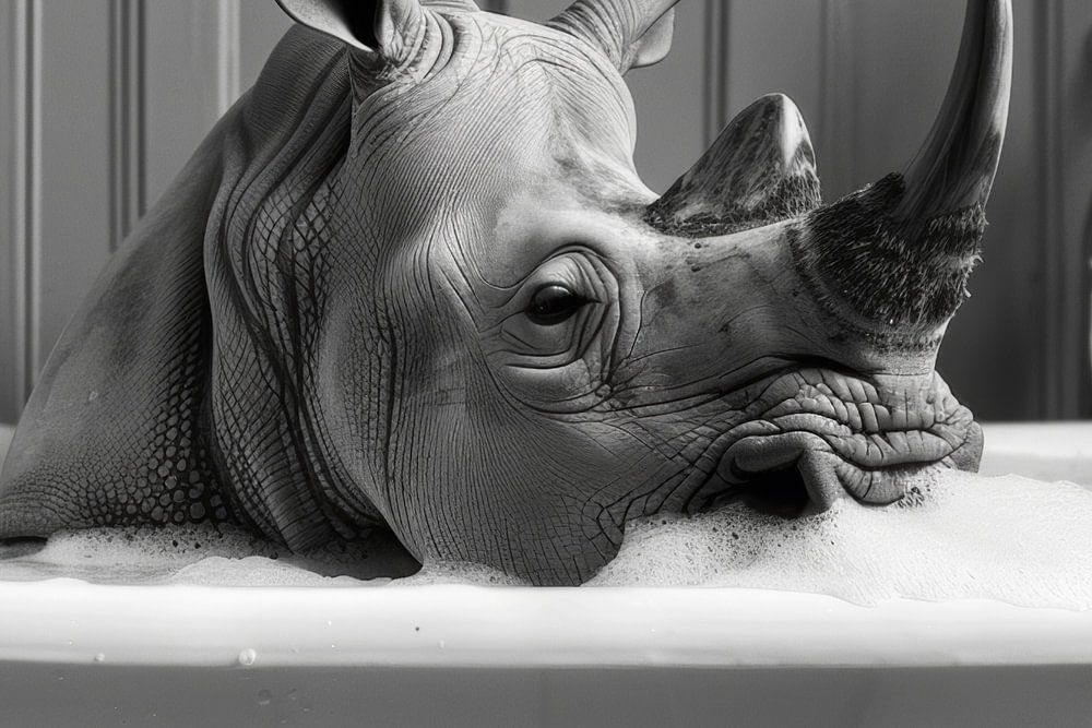 Ce tableau de salle de bain unique représente un rhinocéros détendu qui se repose confortablement dans sa baignoire et donne à vos toilettes une atmosphère très particulière. La photographie en noir et blanc capture la sérénité du rhinocéros et souligne les détails de la scène, ce qui en fait un ajout charmant et unique à votre décoration de salle de bains. Parfaitement adapté à l'embellissement de vos toilettes ou de votre salle de bain, il rappelle que même les animaux puissants peuvent profiter de moments de calme et de détente. Cette série de tableaux de salle de bains modernes offre une décoration élégante qui non seulement suscite l'émerveillement, mais ajoute également une touche d'harmonie à votre salle de bains. Avec cette charmante œuvre d'art, apportez une atmosphère de sérénité et de naturel dans vos toilettes et laissez-vous inspirer par sa sérénité.