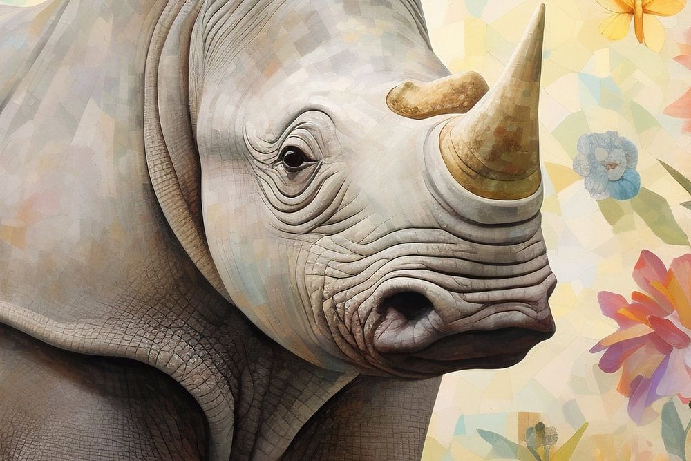 Rhinocéros - Au centre de la toile se trouve un rhinocéros calme, paisiblement entouré d'une flore fleurie et de papillons volants, le tout capturé dans des tons pastel doux et des traits de crayon subtils qui suggèrent une union harmonieuse de la faune et de la flore.
