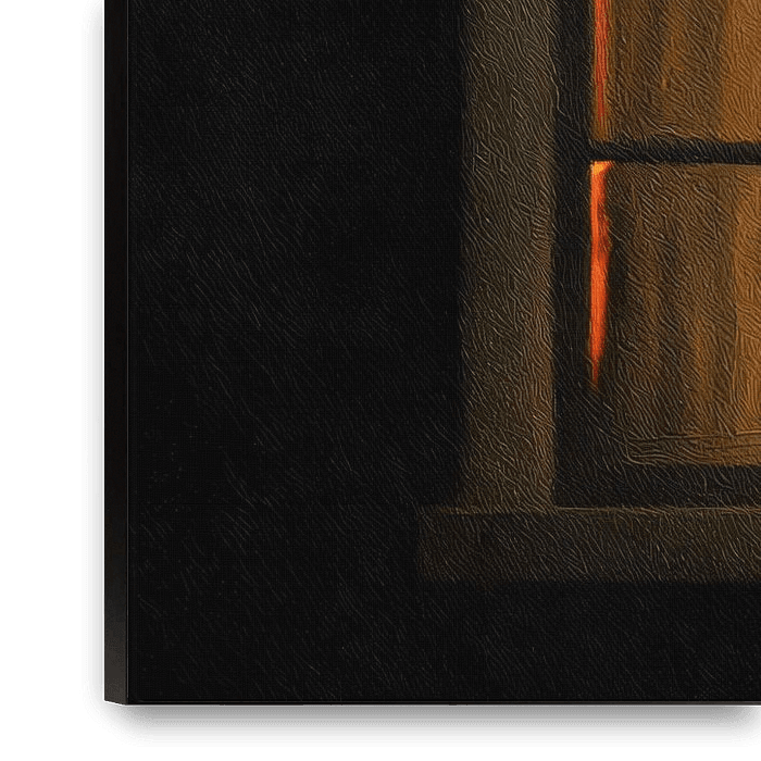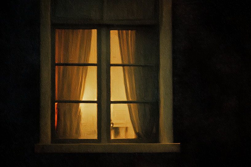 Une fenêtre en gros plan, des rideaux qui s'ouvrent doucement et une lumière intérieure chaleureuse qui touche la nuit. L'image est simple, mais c'est justement ce qui la rend si forte. Vous regardez une frontière : le verre entre l'intérieur et l'extérieur, l'intimité et la curiosité. Les rideaux apportent du mouvement et de la douceur, comme si quelqu'un venait de passer ou d'entrer dans la pièce. La lumière est chaude, presque couleur miel, et contraste avec la façade sombre qui encadre la fenêtre. La texture donne à l'ensemble un aspect pictural, comme si la lumière ne brillait pas seulement, mais reposait également sur la surface. Cette œuvre est intime sans être explicite. Elle ne raconte rien littéralement, mais suggère une présence, une histoire, une vie derrière la fenêtre. Dans un intérieur, cette image crée une tension tranquille. Elle trouve sa place au-dessus d'un canapé, dans un hall d'entrée ou dans une chambre à coucher, où l'on souhaite créer une atmosphère chaleureuse sans que cela devienne décoratif. Une petite image, mais qui respire la vie.