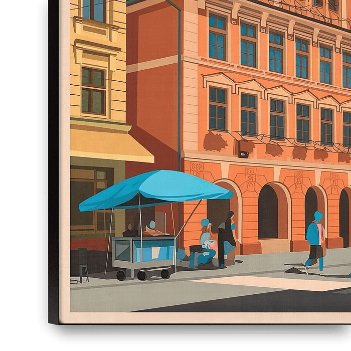 Sous un ciel radieux, un charmant bâtiment historique trône avec une façade fascinante aux chaudes nuances de rouge. Les élégantes dentelles et les ornements de détail élaborés forcent le regard, tandis que des piétons affairés incarnent la vie trépidante de la ville. Une simple échoppe souligne le charme de la rue et invite à la…