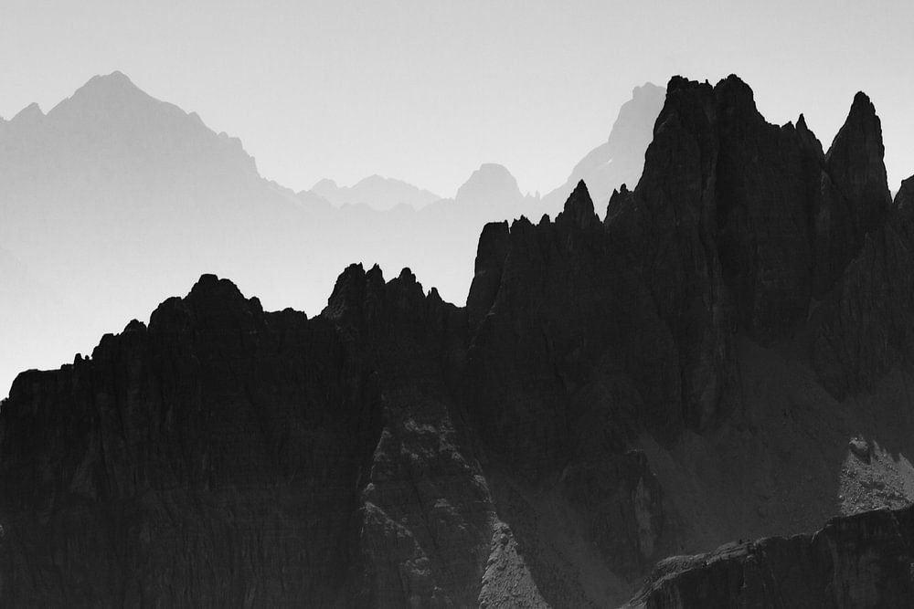 De Dolomieten in Italië. Overdag gefotografeerd vanaf Rifugio Lagazuoi tijdens een warme zomerdag. De atmosferische werking in de lucht creëert diepte in het beeld. Door het beeld om te zetten in zwart-wit was er meer uit het contrast te halen.
