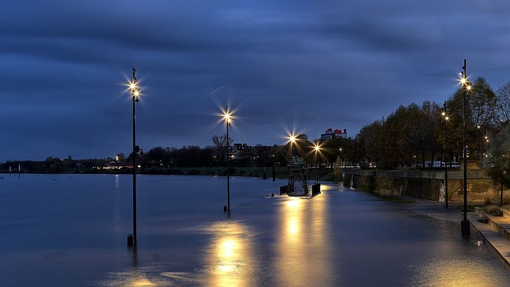 Cette photo prise en soirée montre la Meuse à Venlo à un moment où la nature a subtilement transformé le paysage urbain. En raison de la crue de la rivière, les lampadaires sont partiellement immergés, ce qui renforce encore davantage le reflet de leur lumière chaude sur la surface lisse. Le quai moderne, la rangée d'arbres et les…