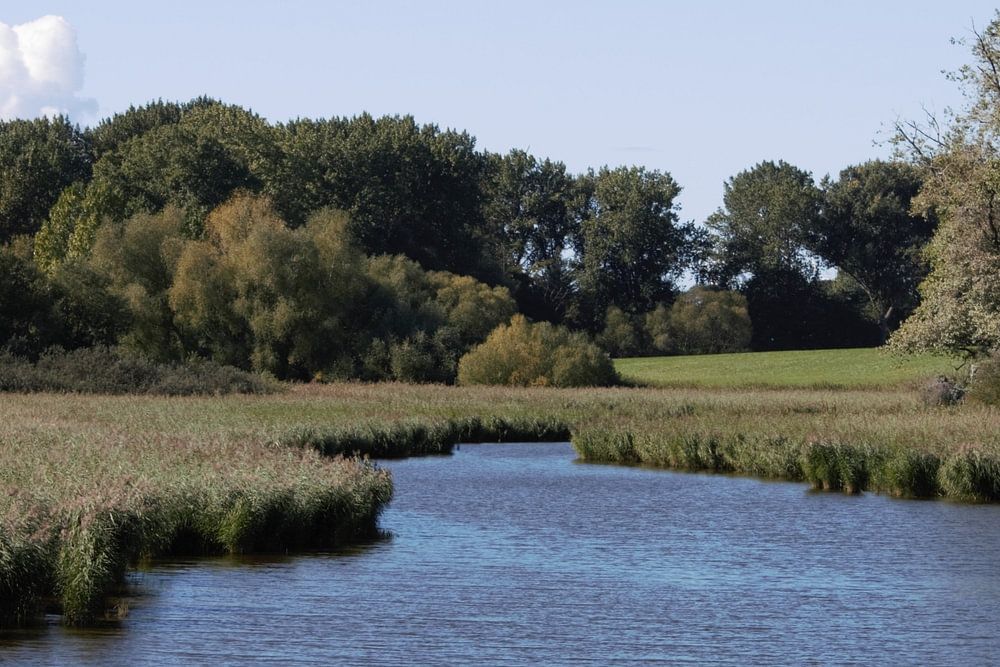 Une rivière paisible serpente à travers un paysage idyllique de prairies et d'arbres. Le reflet du ciel dans l'eau et le vert intense des environs créent une ambiance paisible, presque pittoresque.