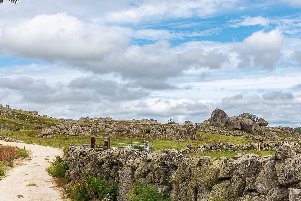 Chemin de randonnée dans le parc naturel français de l'Aubrac, ici dans le département de la Lozère, par une journée légèrement nuageuse du mois d'août, loin des villes et des foules, ce paysage respire la paix et la tranquillité.