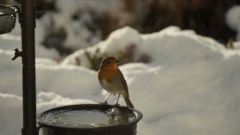 Un mignon petit rouge-gorge assis près d'un bol d'eau gelé, avec de la neige en arrière-plan.