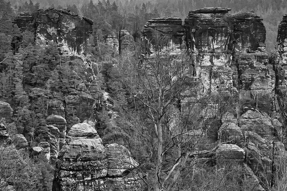 Rocher dans le massif de l'Elbsandstein à la Bastei en noir et blanc. Des roches fissurées entourées d'arbres.