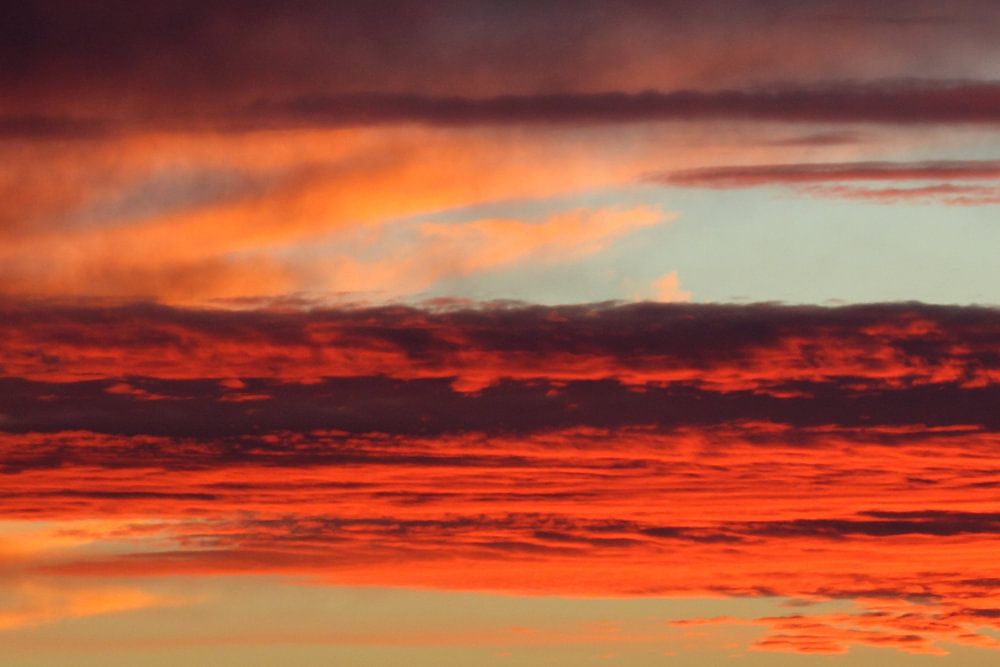 Prachtige rode kleuren van de hemel tijdens de ondergang van de zon op de Canarische eiland La Palma. De laatste zonnestralen, net voordat ze achter de Atlantische Oceaan verdwijnen en donkere nacht tevoorschijn komt. Deze fase duurt slechts een paar minuten maar blijft lang fascineren.