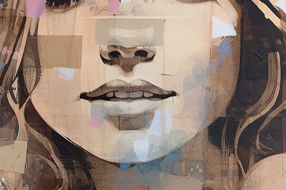 Rosa Portrait - peinture abstraite / mixed media art peint. Joli contraste entre un portrait sophistiqué et une technique de collage/peinture brute.