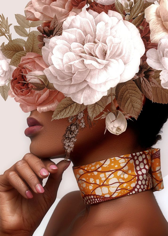 Portrait d'une femme africaine avec une coiffe de belles roses.