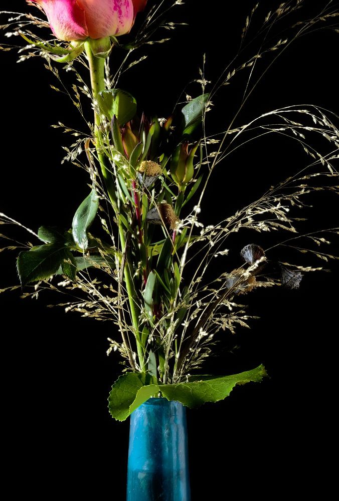 A propos de "Rose dans un vase en verre bleu sur fond noir"
