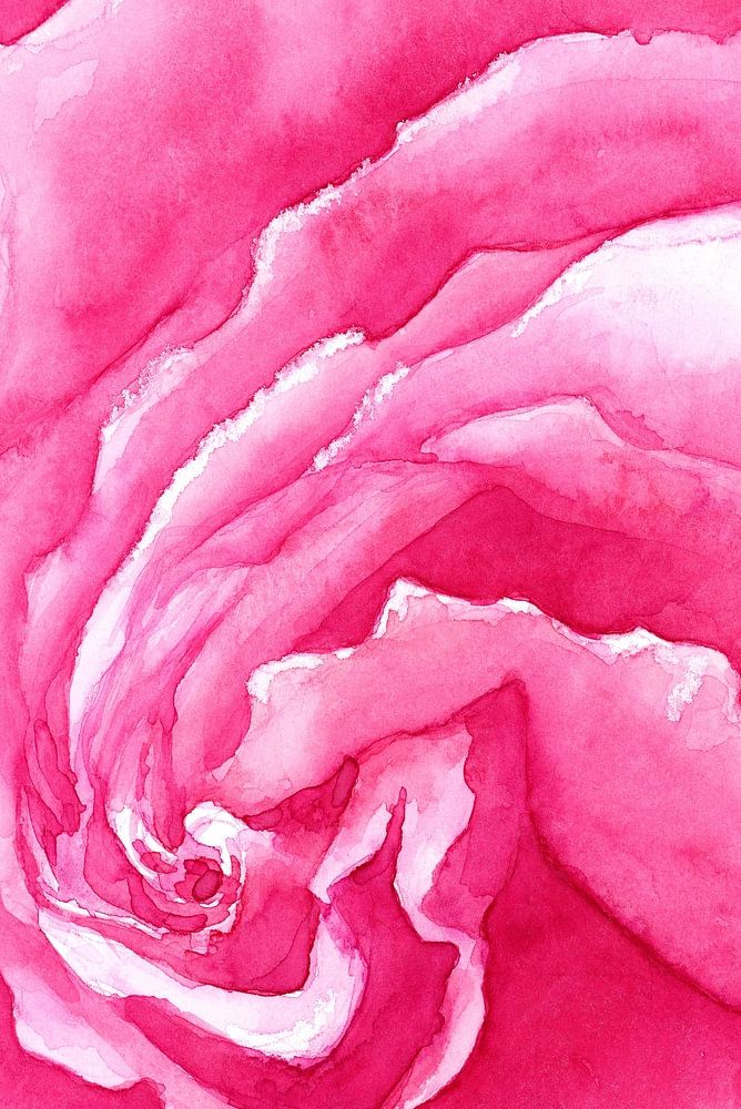 Rose rose en gros plan est une aquarelle en format vertical peinte par l'artiste Karen Kaspar. L'image montre l'intérieur d'une fleur de rose dans des tons de rose et de rose vifs. La peinture est monochrome, avec des nuances de rose et de rose, interrompues par le blanc du fond en papier. Le centre de la fleur s'enroule en spirale. Il en résulte presque une image abstraite d'une spirale. Qui peut résister à la beauté d'une rose ? Ces fleurs enchanteresses enthousiasment les artistes, les jardiniers et les amateurs par leurs couleurs éclatantes et leur parfum odorant. 185