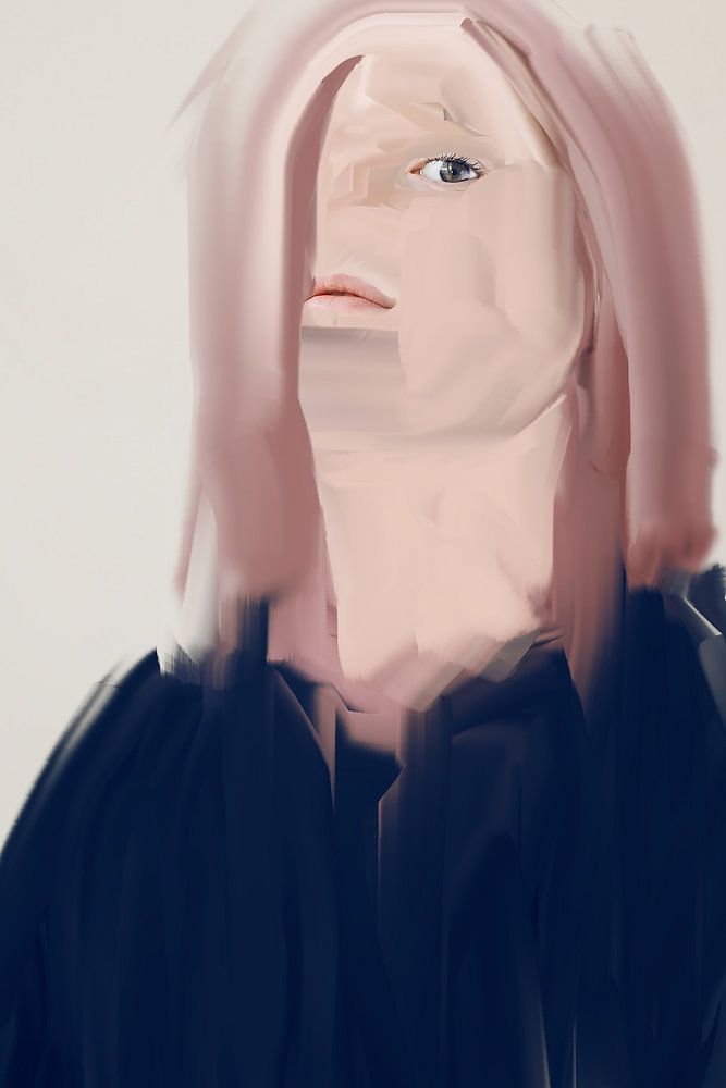 Œuvre d'art numérique : rose. La fille aux cheveux roses et au pull bleu foncé vous regarde droit dans les yeux derrière ses mèches roses.