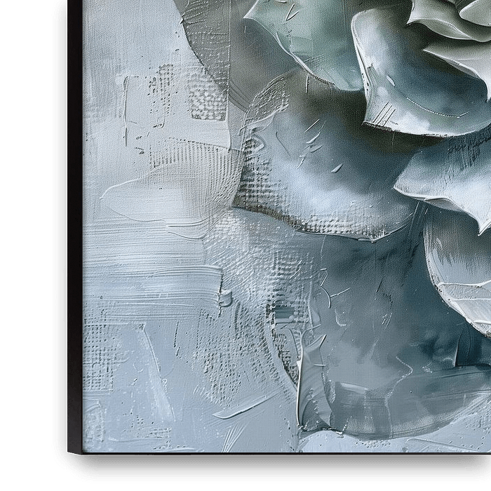 Dans cette œuvre, l'Echeveria occupe une place centrale en tant que forme sculpturale. La structure en rosette est plus clairement élaborée, avec des feuilles qui se chevauchent et créent de la profondeur et du mouvement. La composition est plus dense et plus riche que dans l'autre œuvre, ce qui rend la plante plus présente dans…