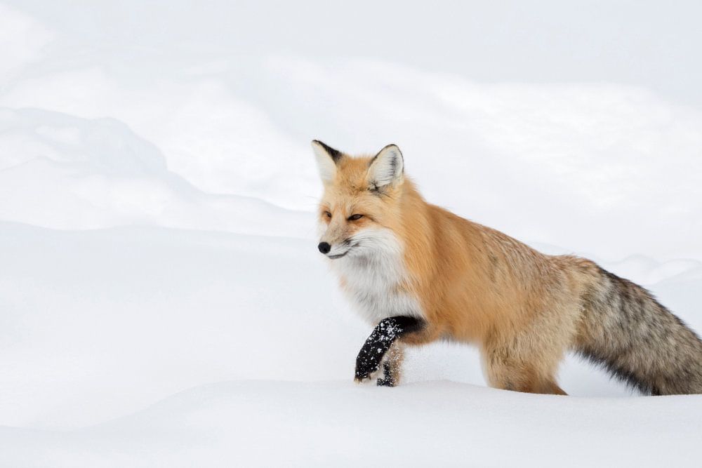 Rotfuchs / Red Fox ( Vulpes vulpes ) in winter, running through deep snow, Yellowstone NP, Wyoming, USA.