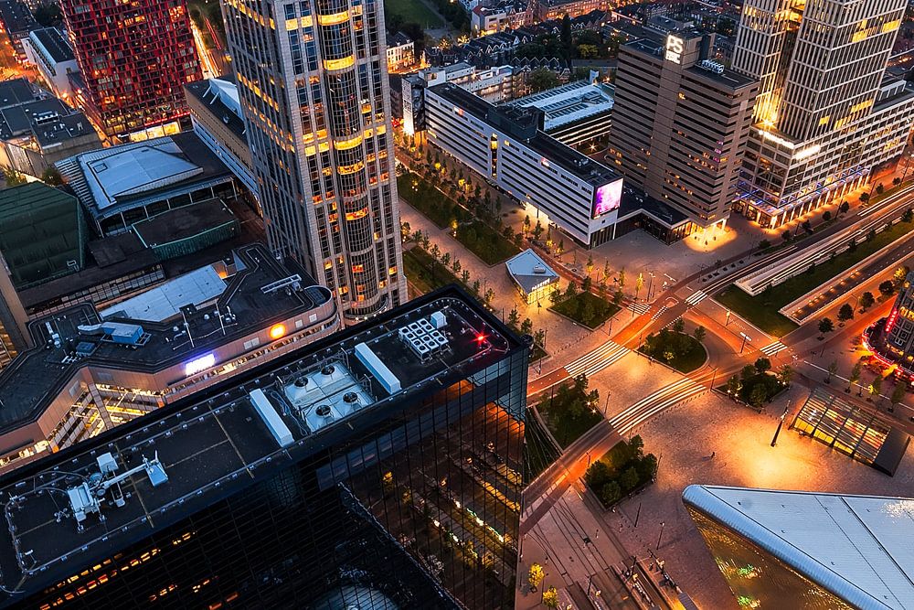 Het plein voor het Centraal Station in Rotterdam gezien vanaf de Delftse Poort