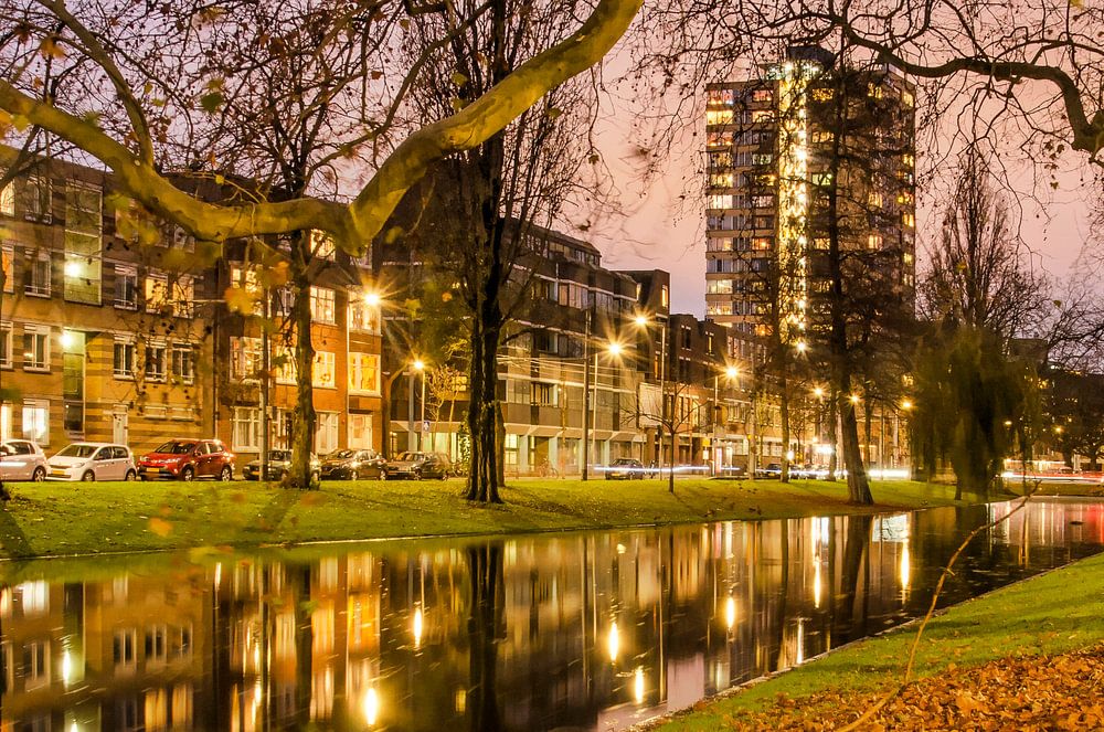 Le Noordsingel à Rotterdam, qui fait partie du Projet Eau de l'ingénieur Rose du XIXe siècle, pendant l'heure bleue, un soir de fin d'automne (ou de début d'hiver). Des platanes aux branches déchiquetées, des feuilles tombées dans le grastalud, des bandes de lumière provenant de voitures et de bâtiments de différentes époques qui se reflètent dans l'eau du canal.
