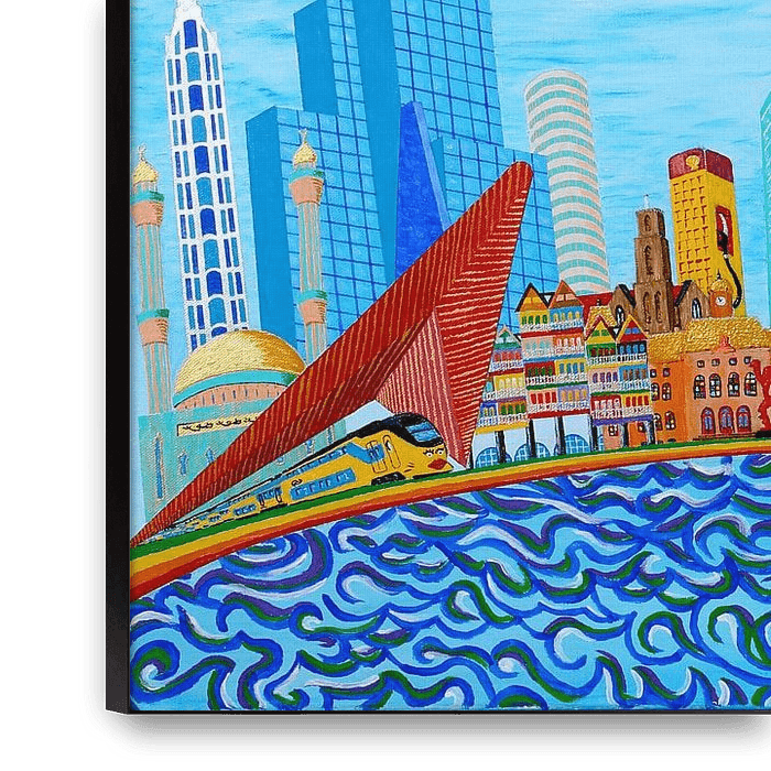 Ce tableau joyeux et coloré (80 x 120 cm en peinture acrylique) reflète mon impression personnelle du nouveau Rotterdam en 2017, tantôt réaliste, tantôt clin d'œil.