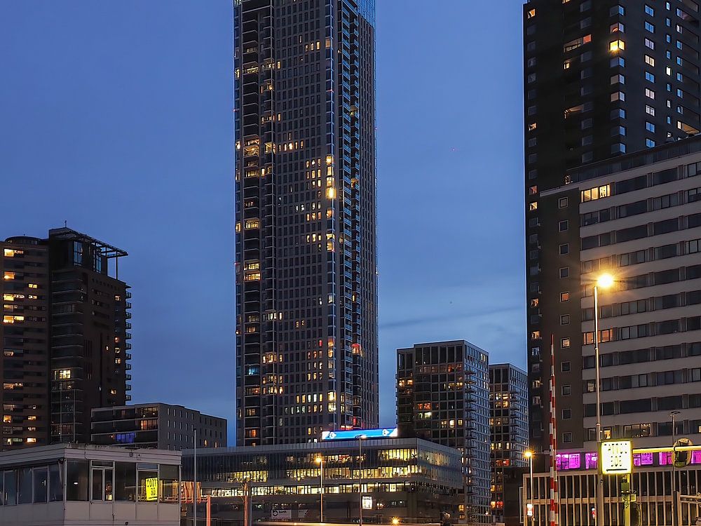 En utilisant une vitesse d'obturation de deux secondes (pour faire bouger le trafic), j'ai pris cette photo de la tour Zalmhaven sur le Kop van Zuid à Rotterdam.