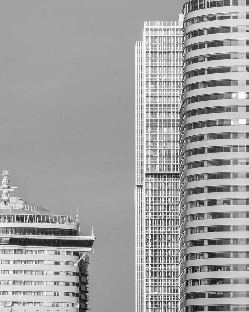 Au moment de la photo, le bateau de croisière Iona était ancré au terminal de croisière de Rotterdam. Cela donne une belle relation avec les gratte-ciel sur le Kop van Zuid.