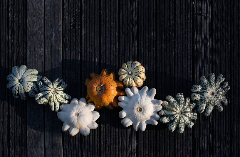 Plusieurs citrouilles décoratives sont posées sur un support en bois sombre. Elles sont photographiées d'en haut. On dirait que les citrouilles forment un engrenage, reliées entre elles.