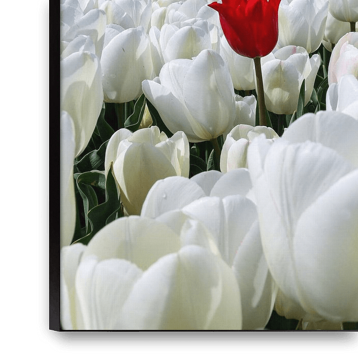 Parmi toutes ces tulipes blanches, il y avait une tulipe rouge qui se distinguait de toutes les autres. La coïncidence des couleurs rouge, blanc et bleu de l'image en fait une image typiquement néerlandaise.