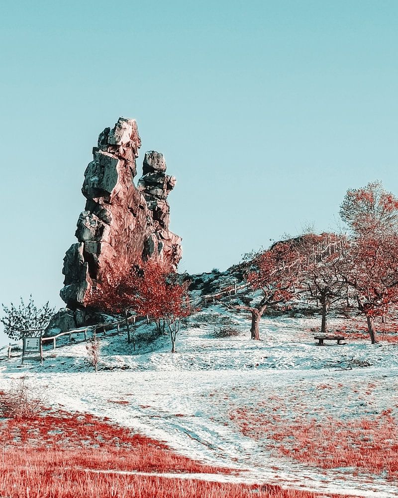 L'image des Mittelsteine transmet, dans le style aérochrome infrarouge, l'immensité glacée et le calme bienfaisant d'une journée d'hiver radieuse à la lisière du nord du Harz.