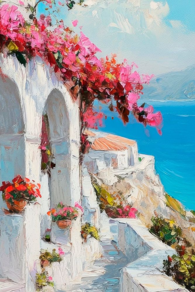 Un sentier pittoresque serpente le long des falaises, bordé de bougainvilliers en fleurs d'un rose intense. En dessous, l'eau d'un bleu azur scintille tandis que les nuages traversent doucement le ciel. Cette idylle donne l'impression d'un rêve où le temps semble s'être arrêté, parfait pour les pensées romantiques et les moments d'insouciance.