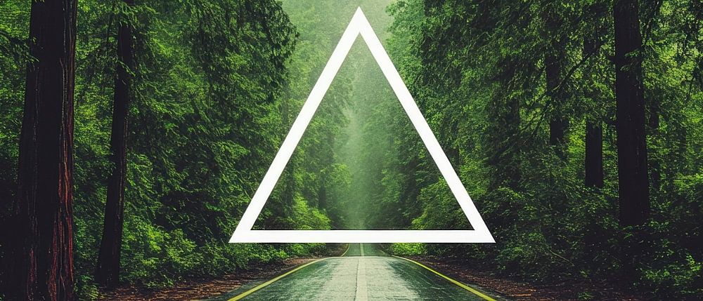Un triangle minimaliste flotte au-dessus d'une route brumeuse, entouré d'arbres majestueux qui créent une atmosphère mystérieuse. Les douces nuances de vert et l'asphalte pluvieux plongent le spectateur dans un état méditatif. Idéal pour le salon, pour apporter calme et inspiration dans le quotidien.