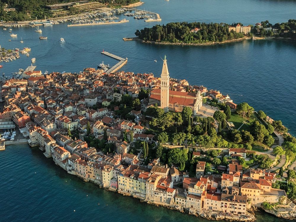 Vue sur l'église Sveta Eufejima vers l'île de Santa Caterina, Rovinj, Istrie, Croatie