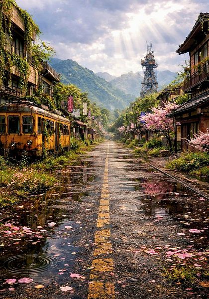 À gauche de l'image se trouve un vieux train ou tramway, jaunâtre et patiné par les intempéries, envahi par la végétation, qui donne l'impression de ne plus avoir été utilisé depuis longtemps. Les bâtiments de part et d’autre de la rue semblent également abandonnés : les façades sont vieillies, en partie endommagées et envahies par la végétation. De petits panneaux et détails suggèrent qu’il s’agissait autrefois d’une rue animée.