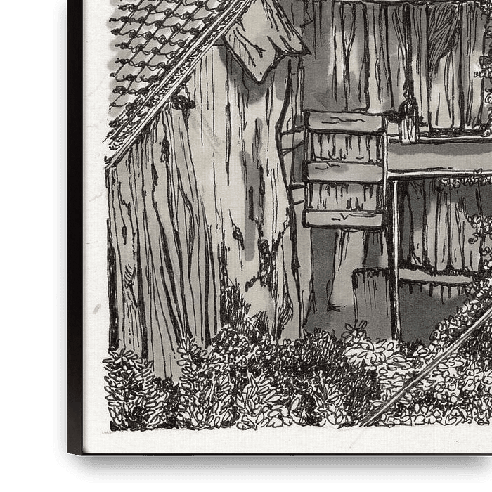 Dessin à la plume : Fineliner et marqueur format original a5 ( 14.8x21 cm ) Rue du sud du Limbourg avec maisons à colombages et vieille grange