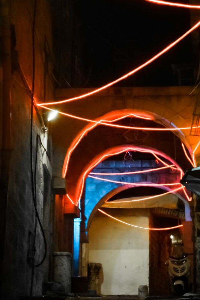 A propos de "Rue illuminée de guirlandes et de lumières de Noël, Jérusalem du Nouvel An. Rues étroites et sombres"