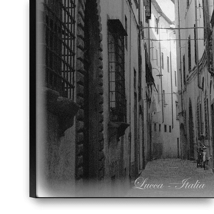 Une rue italienne typique en noir et blanc. Le soleil brille sur les façades et il fait chaud. Il n'y a pas de vent et le seul refroidissement qu'il y a est l'ombre. On ne peut pas faire plus italien à Lucca, en Italie.