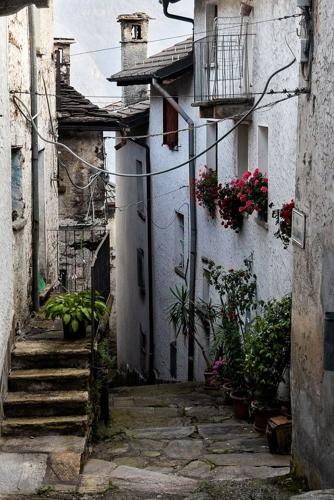 Une rue pittoresque de Spoccia, près de Cannobio, dans le Piémont, en Italie, dégage un charme d'antan avec ses ruelles pavées, ses bâtiments traditionnels en pierre et ses fleurs éclatantes qui ornent les portes et les fenêtres. Cette scène pittoresque capture l'essence de la vie d'un village italien, vous invitant à vous promener et à vous imprégner de l'atmosphère authentique.