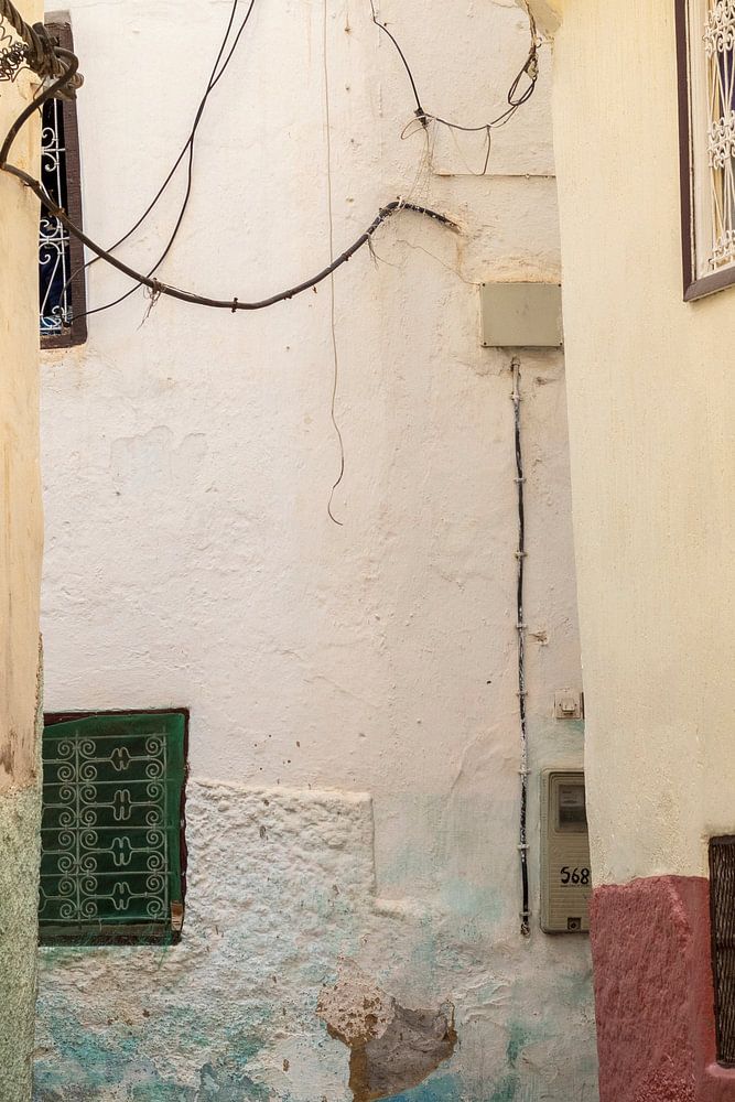 Cette allée lumineuse colorée, blanche, beige, rouge et vert menthe, située au Maroc, reflète une imperfection parfaite. Tout est de travers, mais avec des lignes droites. Le câblage légèrement lâche complète le tout. Cela rend l'image photogénique !